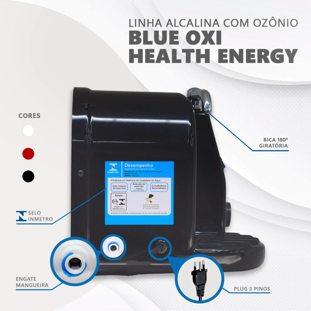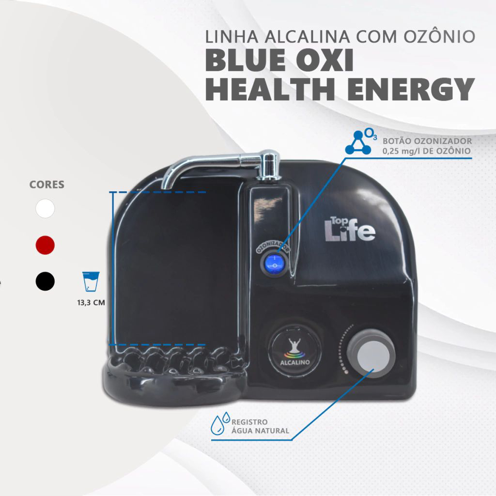 O Top Life Blue HE Oxi é um purificador de água compacto e eficiente, que combina a tecnologia de ozonização e alcalinização, garantindo água de alta qualidade para consumo diário. Com um sistema avançado de filtragem, ele elimina impurezas, melhora o pH da água e proporciona mais segurança e bem-estar para toda a família.