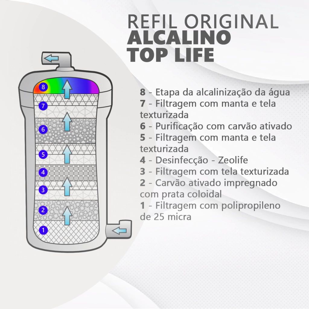 O Refil Alcalino da Top Life é um componente essencial para os purificadores de água da marca, projetado para elevar a qualidade da água consumida, proporcionando diversos benefícios à saúde.